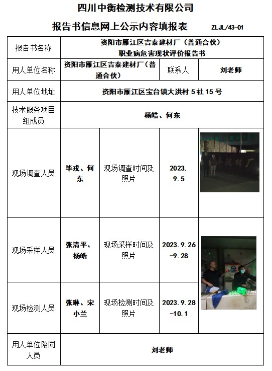 資陽市雁江區(qū)吉泰建材廠(普通合伙) 職業(yè)病危害現(xiàn)狀評價(jià)報(bào)告書