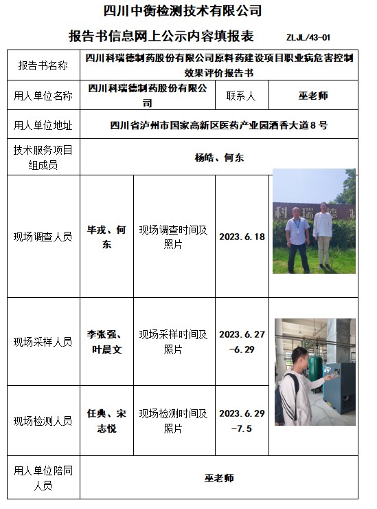 四川科瑞德制藥股份有限公司原料藥建設(shè)項目職業(yè)病危害控制效果評價報告書