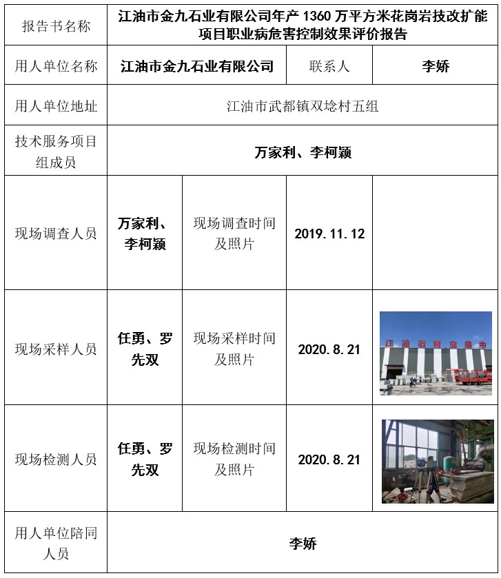 江油市金九石業(yè)有限公司年產(chǎn)1360萬平方米花崗巖技改擴能項目職業(yè)病危害控制效果評價報告
