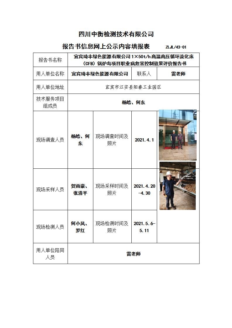 宜賓琦豐綠色能源有限公司1×50t/h高溫高壓循環(huán)流化床(CFB)鍋爐島項(xiàng)目職業(yè)病危害控制效果評(píng)價(jià)