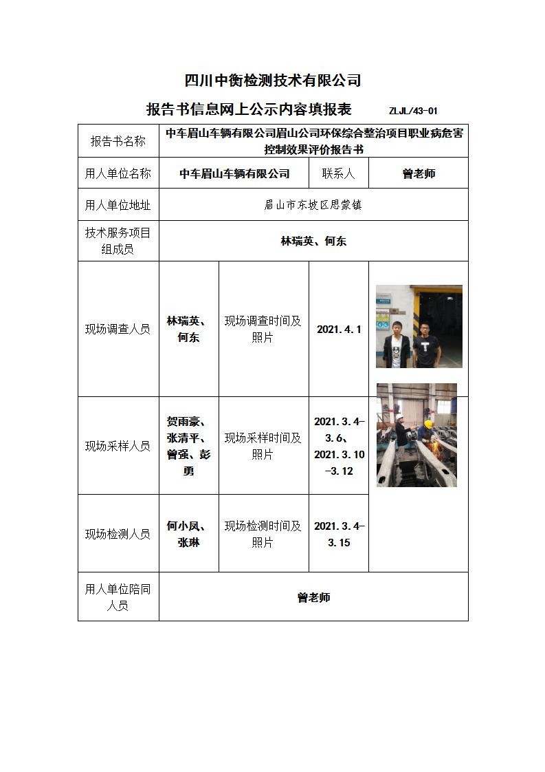 中車眉山車輛有限公司眉山公司環(huán)保綜合整治項目職業(yè)病危害控制效果評價報告書