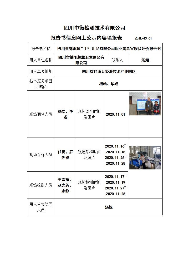 四川省綿陽超蘭衛(wèi)生用品有限公司職業(yè)病危害現(xiàn)狀評價