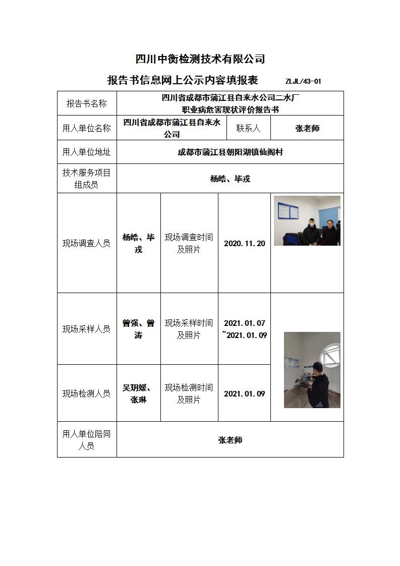 四川省成都市蒲江縣自來水公司二水廠 職業(yè)病危害現(xiàn)狀評價