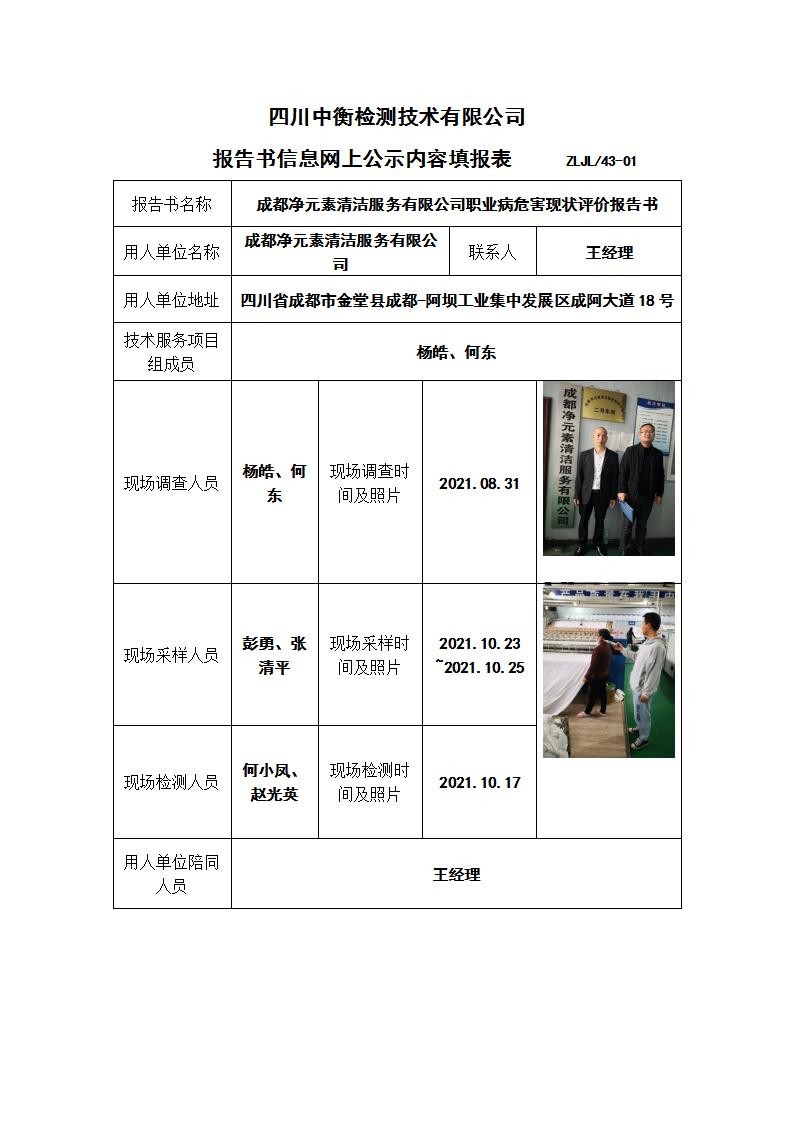 成都凈元素清潔服務(wù)有限公司職業(yè)病危害現(xiàn)狀評價