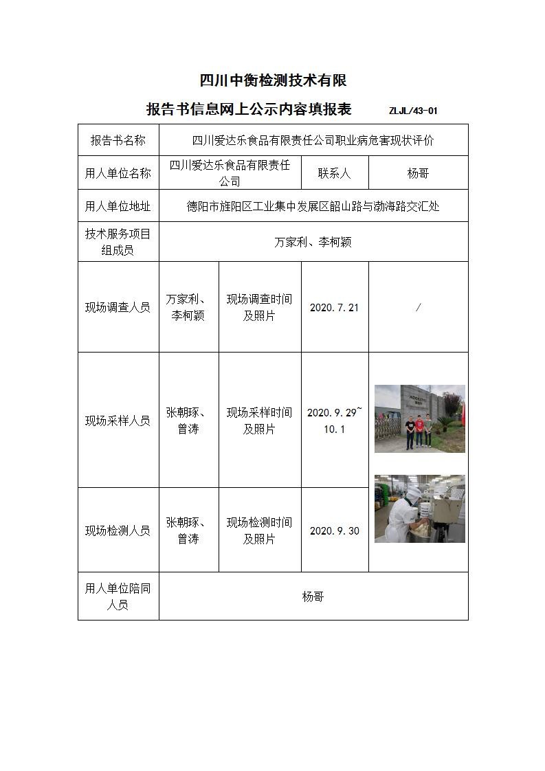四川愛達(dá)樂食品有限責(zé)任公司職業(yè)病危害現(xiàn)狀評價(jià)
