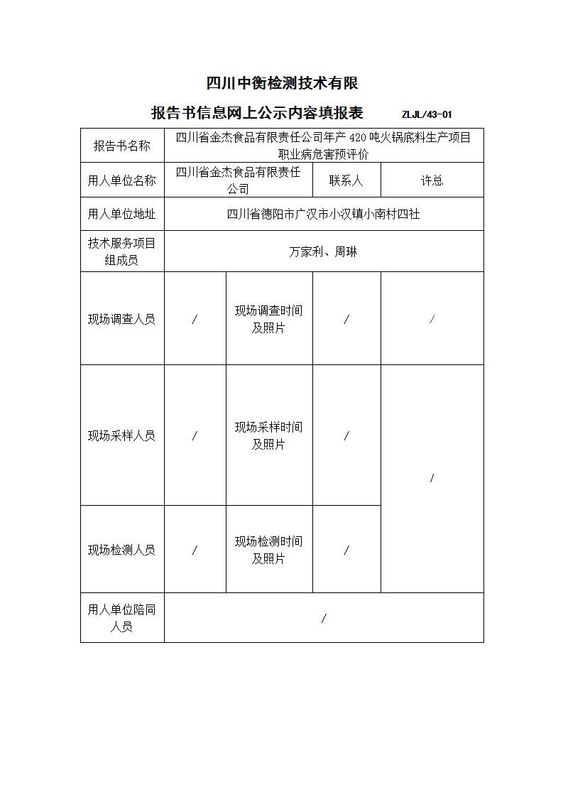 四川省金杰食品有限責(zé)任公司年產(chǎn)420噸火鍋底料生產(chǎn)項目職業(yè)病危害預(yù)評價