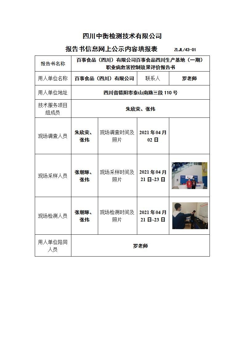百事食品(四川)有限公司百事食品四川生產(chǎn)基地(一期) 職業(yè)病危害控制效果評價報告書