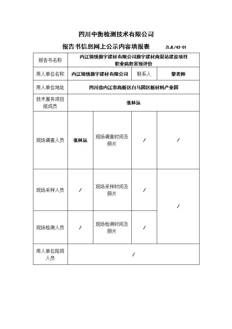 內(nèi)江錦繡瀚宇建材有限公司瀚宇建材商混站建設(shè)項目 職業(yè)病危害預(yù)評價