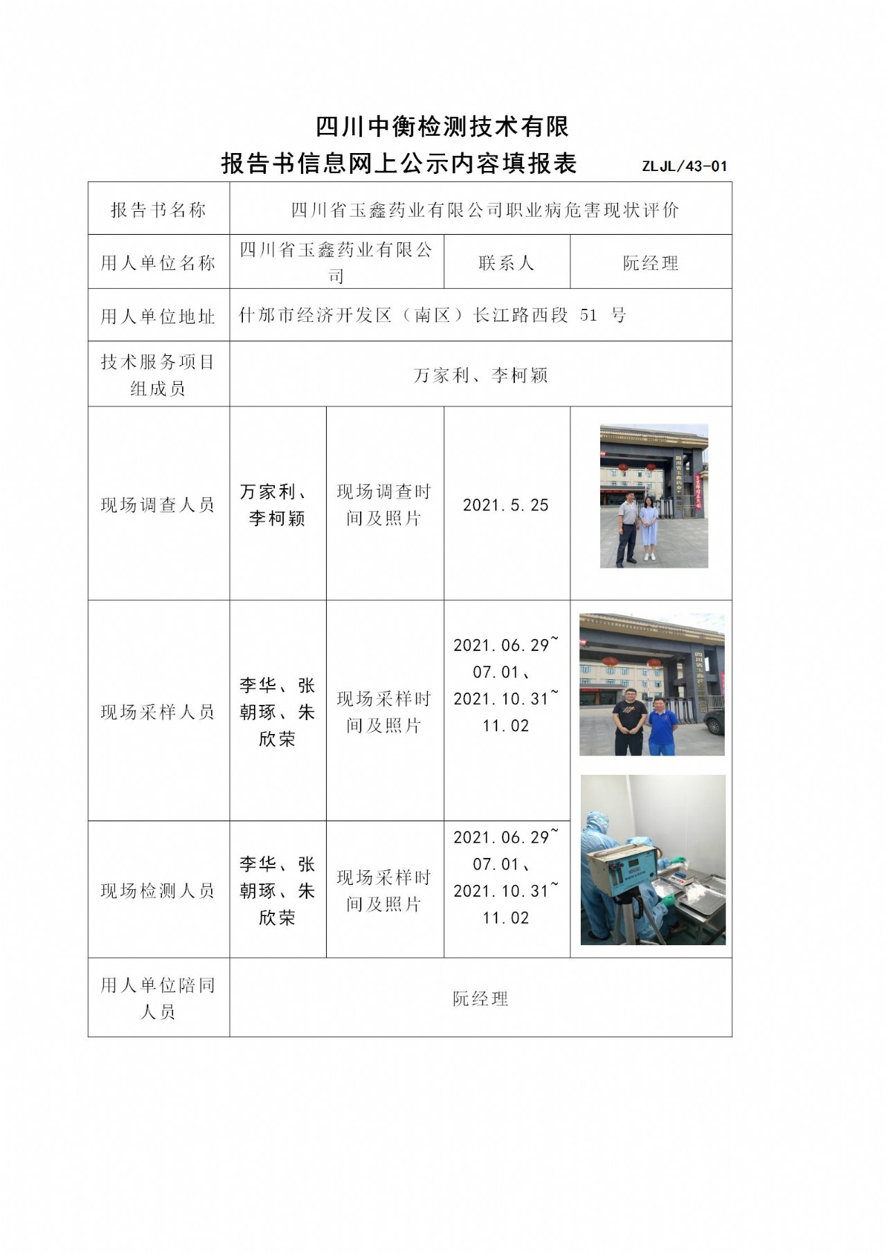 四川省玉鑫藥業(yè)有限公司職業(yè)病危害現(xiàn)狀評價(jià)