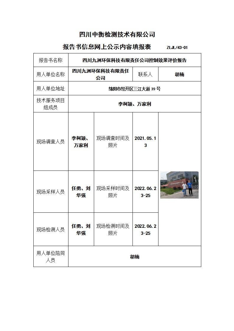 四川九洲環(huán)保科技有限責(zé)任公司控制效果評價報告