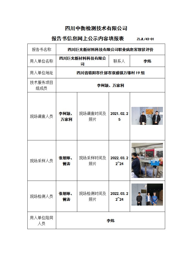 四川巨光新材料科技有限公司職業(yè)病危害現(xiàn)狀評價