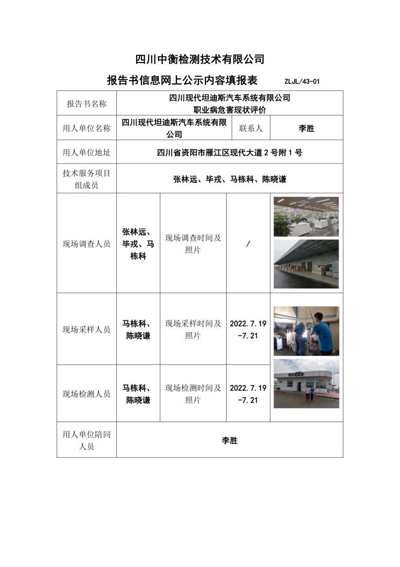 四川現(xiàn)代坦迪斯汽車系統(tǒng)有限公司職業(yè)病危害現(xiàn)狀評價