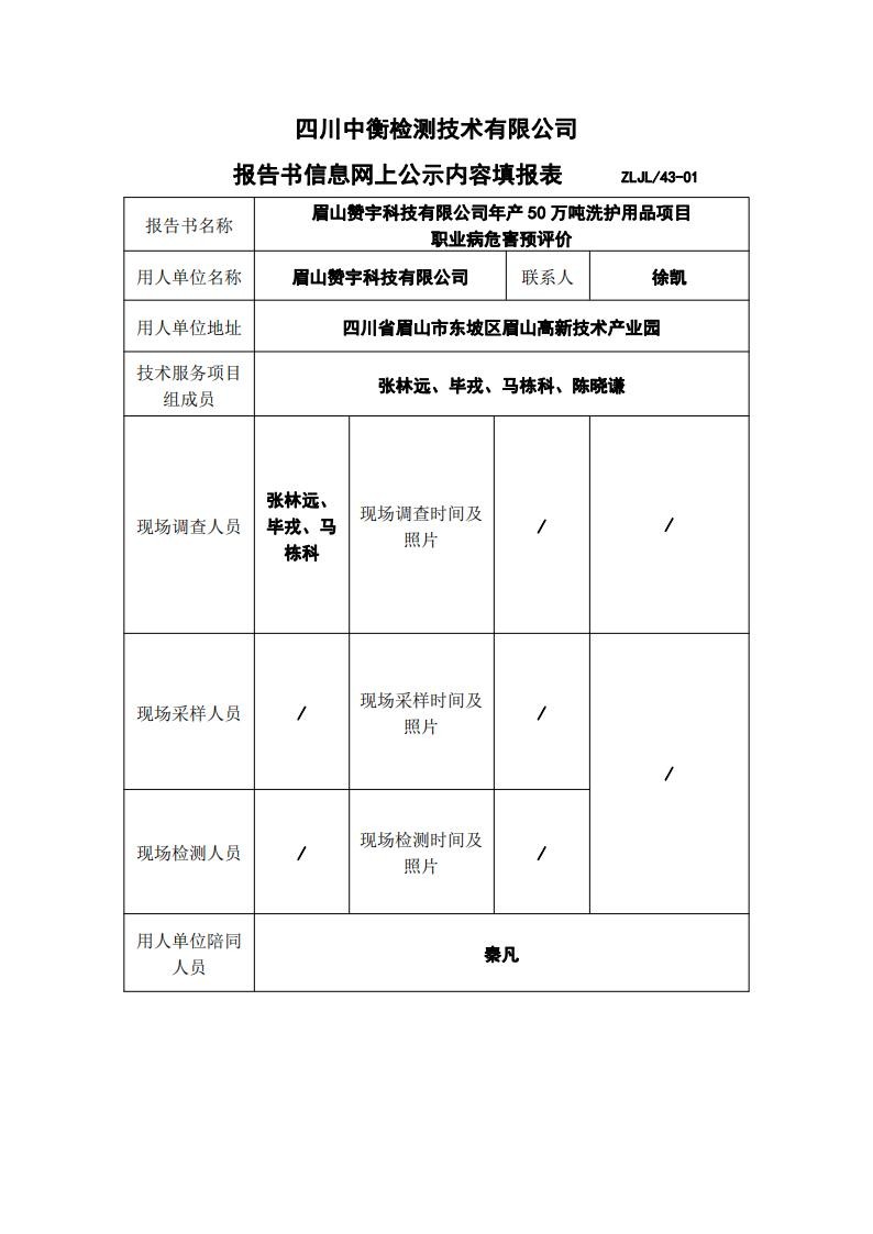 眉山贊宇科技有限公司年產(chǎn)50萬噸洗護用品項目職業(yè)病危害預(yù)評價