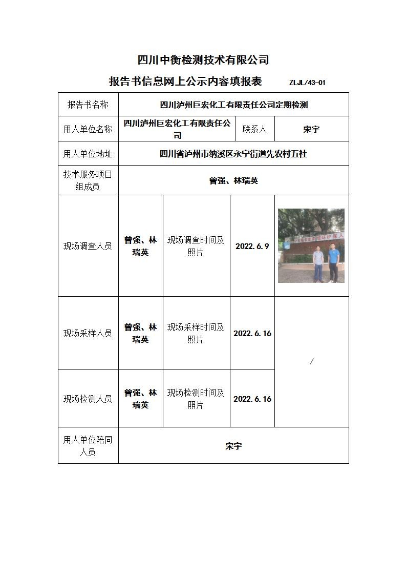 四川瀘州巨宏化工有限責任公司職業(yè)病危害定期檢測