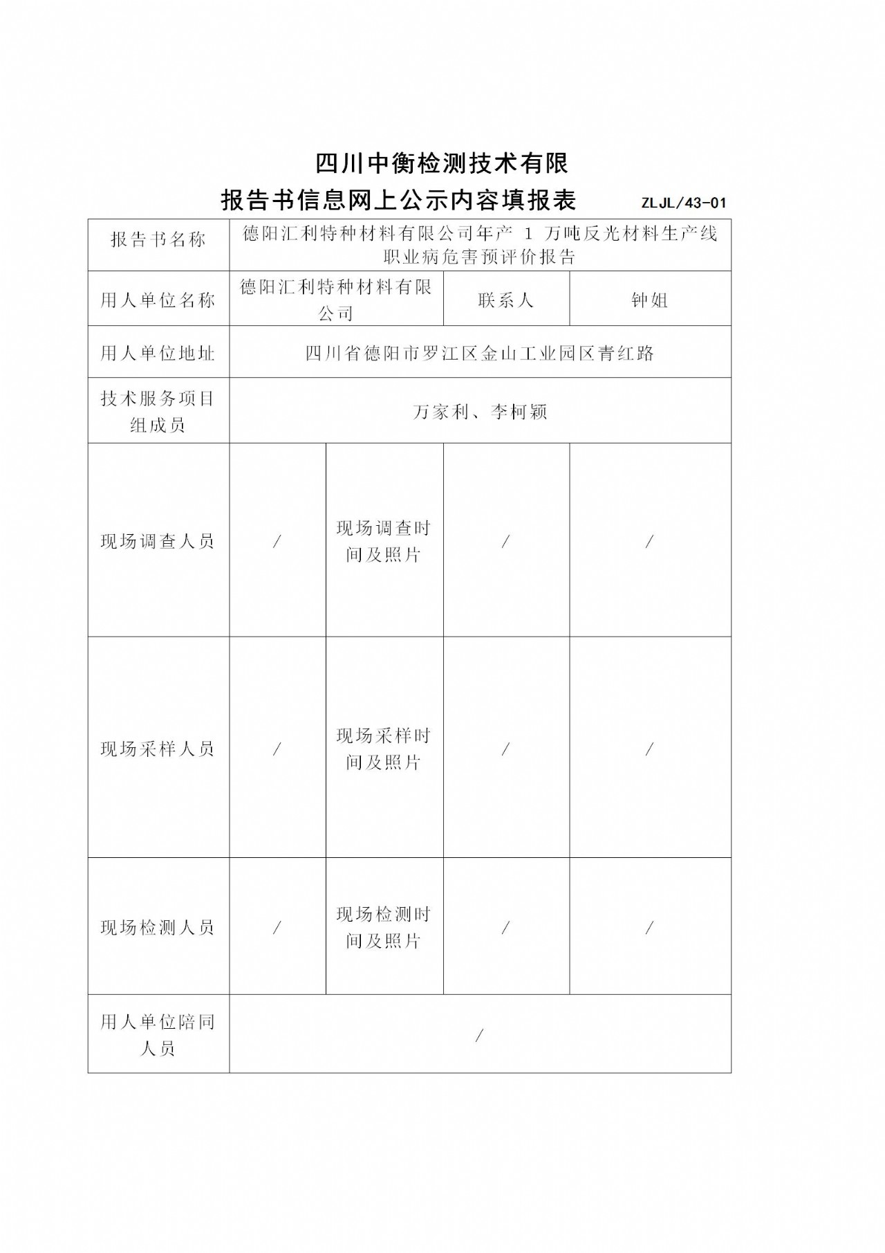 德陽匯利特種材料有限公司年產(chǎn) 1 萬噸反光材料生產(chǎn)線職業(yè)病危害預(yù)評價報告