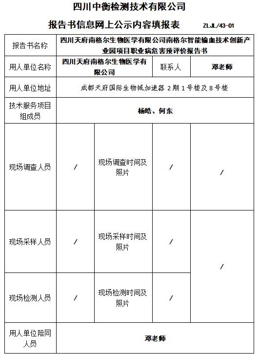 四川天府南格爾生物醫(yī)學(xué)有限公司南格爾智能輸血技術(shù)創(chuàng)新產(chǎn)業(yè)園項(xiàng)目職業(yè)病危害預(yù)評(píng)價(jià)