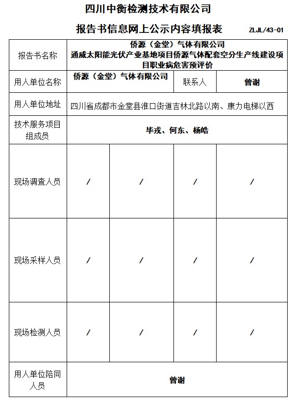 僑源(金堂)氣體有限公司 通威太陽能光伏產(chǎn)業(yè)基地項(xiàng)目僑源氣體配套空分生產(chǎn)線建設(shè)項(xiàng)目職業(yè)病危害預(yù)評(píng)價(jià)