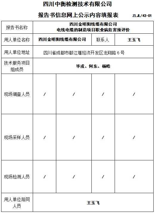 四川金明陽線纜有限公司 電線電纜的制造項(xiàng)目職業(yè)病危害預(yù)評(píng)價(jià)