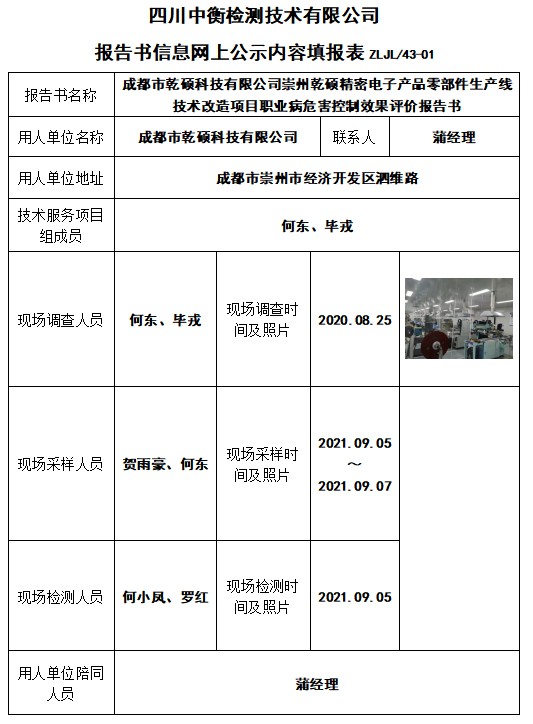 成都市乾碩科技有限公司崇州乾碩精密電子產(chǎn)品零部件生產(chǎn)線技術(shù)改造項(xiàng)目職業(yè)病危害控制效果評(píng)價(jià)