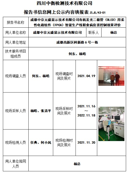 成都中京元盛顯示技術(shù)有限公司有機(jī)發(fā)光二極管(OLED)用柔性電路組件(FPCA)智能生產(chǎn)線職業(yè)病危害控制效果評(píng)價(jià)