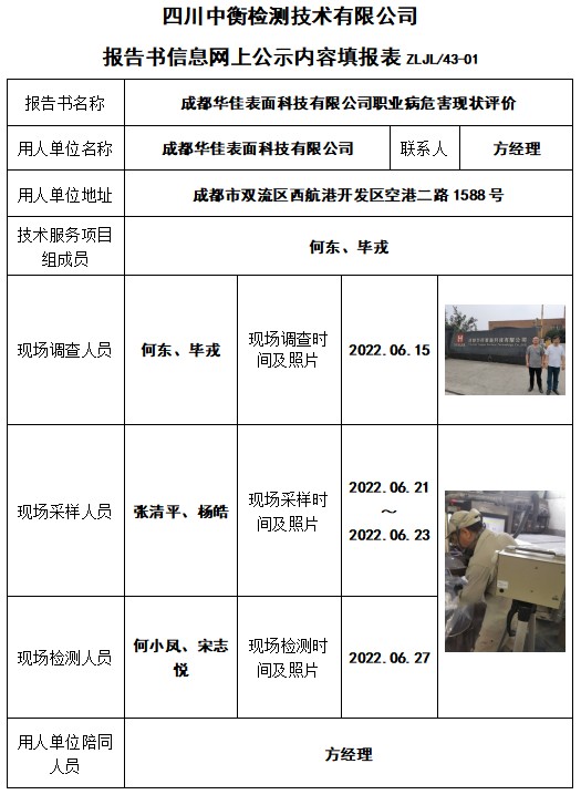 成都華佳表面科技有限公司職業(yè)病危害現(xiàn)狀評價(jià)