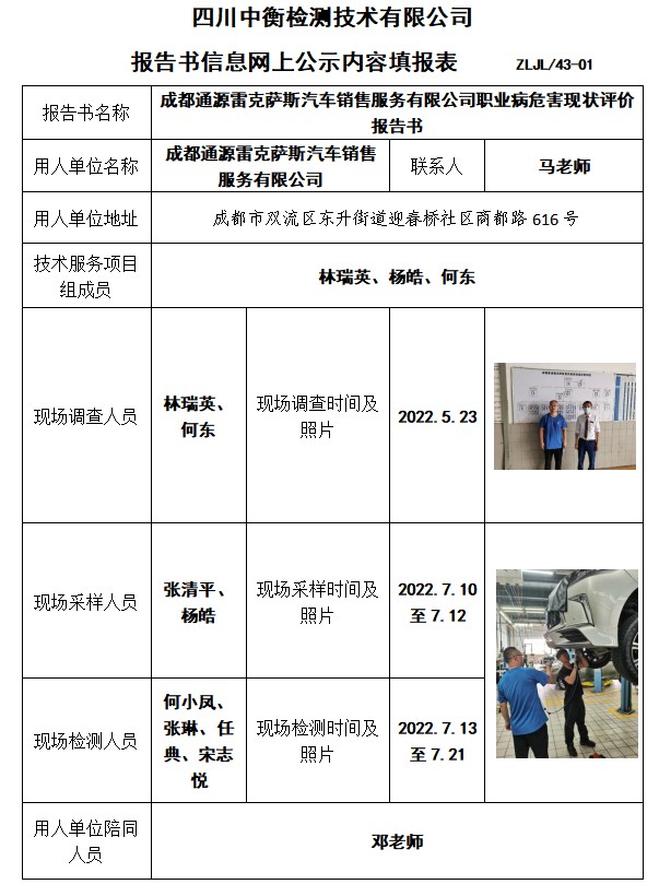 成都通源雷克薩斯汽車銷售服務(wù)有限公司職業(yè)病危害現(xiàn)狀評(píng)價(jià)