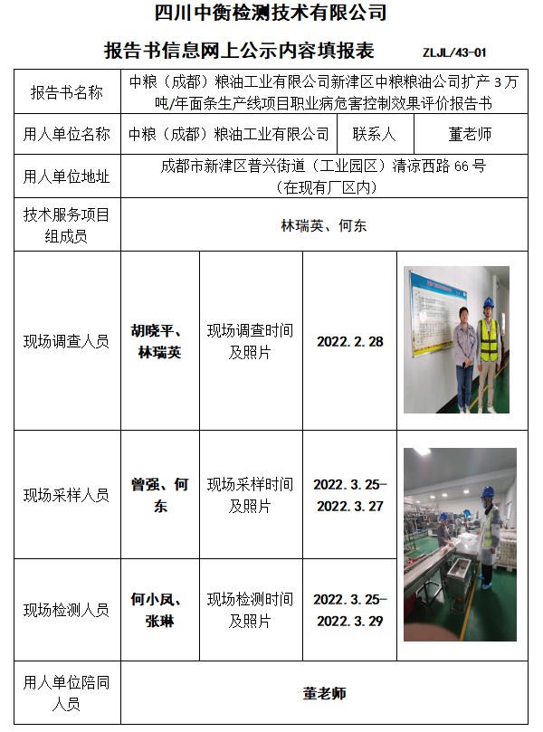 中糧(成都)糧油工業(yè)有限公司新津區(qū)中糧糧油公司擴(kuò)產(chǎn)3萬噸/年面條生產(chǎn)線項(xiàng)目職業(yè)病危害控制效果評價(jià)