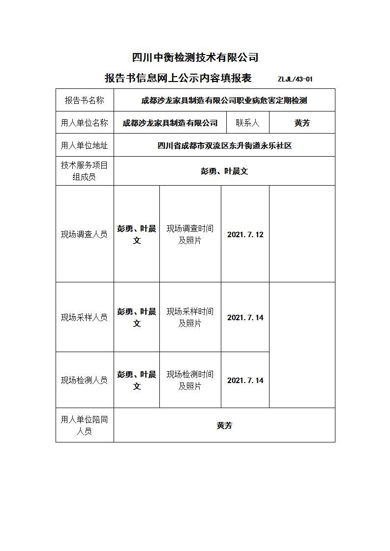 成都沙龍家具制造有限公司職業(yè)病危害定期檢測