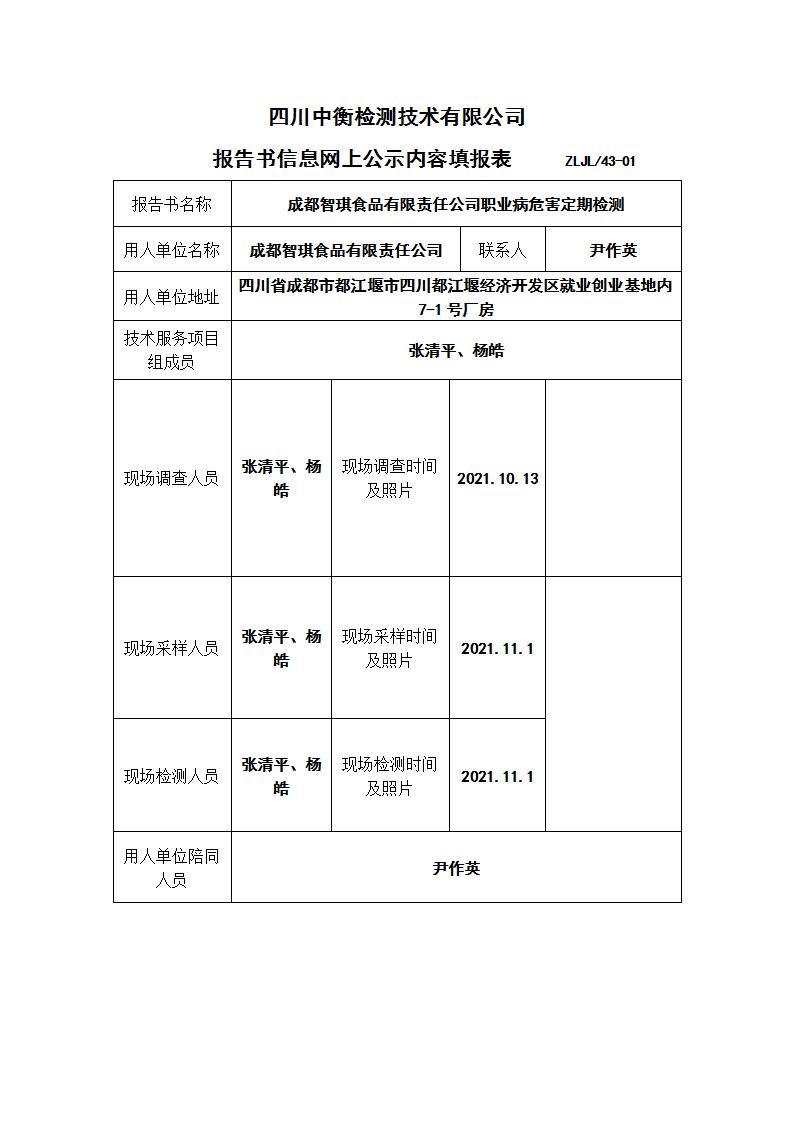 成都智琪食品有限責任公司職業(yè)病危害定期檢測