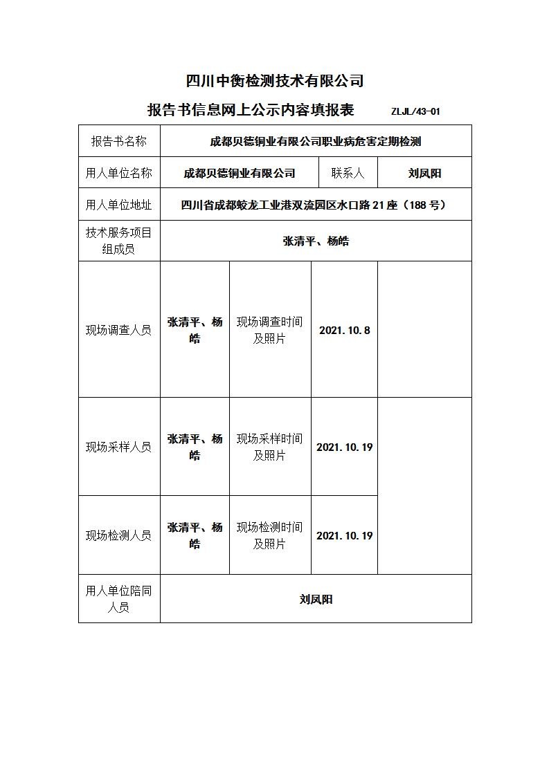 成都貝德銅業(yè)有限公司職業(yè)病危害定期檢測