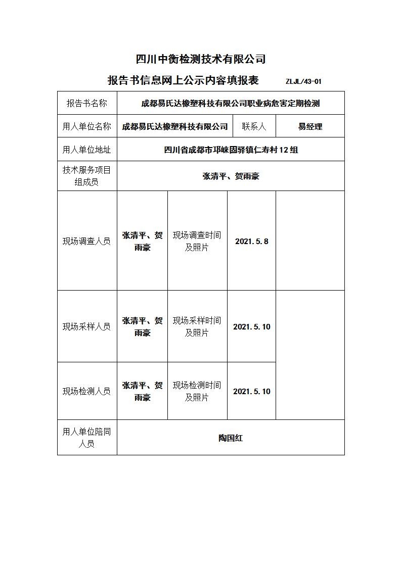 成都易氏達橡塑科技有限公司職業(yè)病危害定期檢測