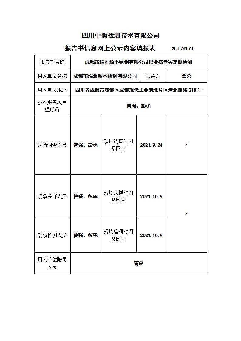 成都市瑞雅源不銹鋼有限公司職業(yè)病危害定期檢測