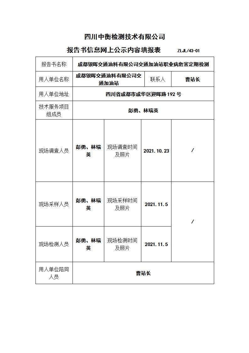 成都銀暉交通油料有限公司交通加油站職業(yè)病危害定期檢測