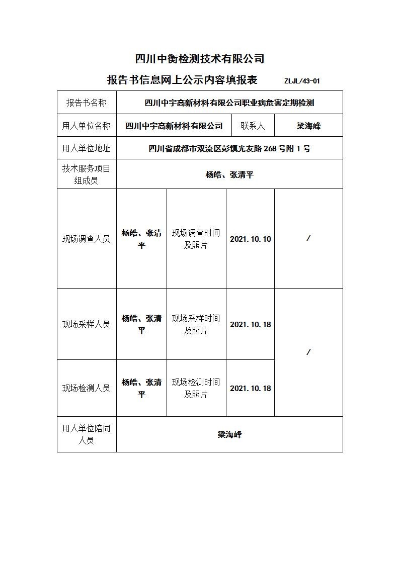 四川中宇高新材料有限公司職業(yè)病危害定期檢測(cè)