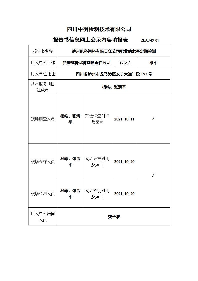 瀘州凱科飼料有限責(zé)任公司職業(yè)病危害定期檢測
