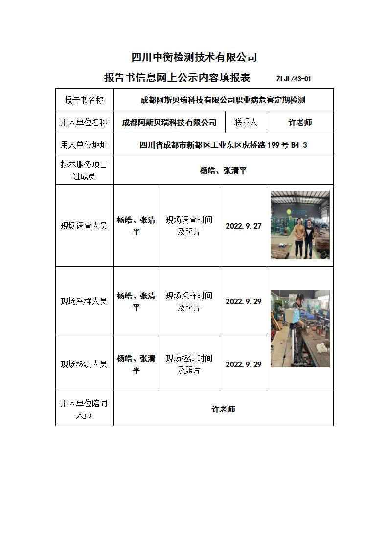 成都阿斯貝瑞科技有限公司職業(yè)病危害定期檢測(cè)