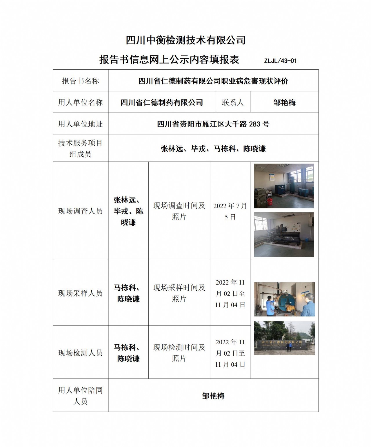 四川省仁德制藥有限公司職業(yè)病危害現(xiàn)狀評價