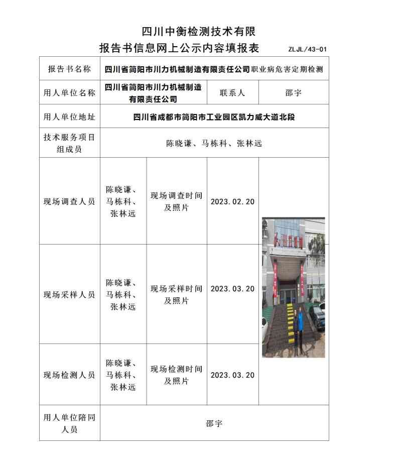 四川省簡陽市川力機械制造有限責任公司職業(yè)病危害定期檢測
