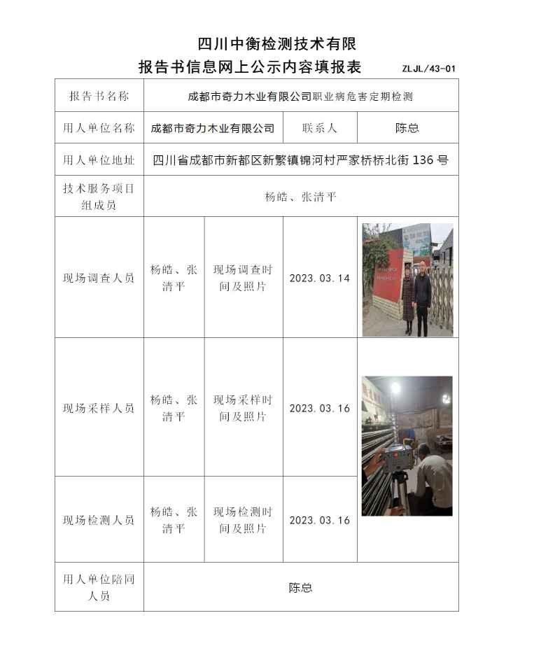 成都市奇力木業(yè)有限公司職業(yè)病危害定期檢測
