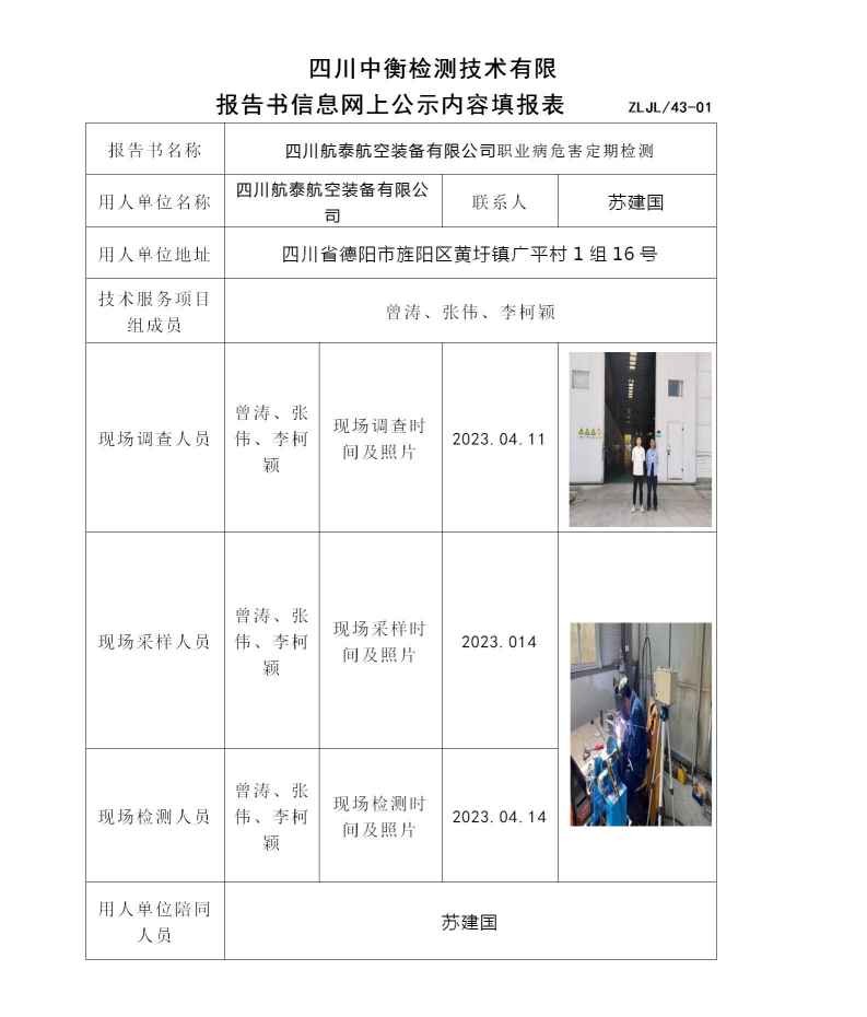 四川航泰航空裝備有限公司職業(yè)病危害定期檢測