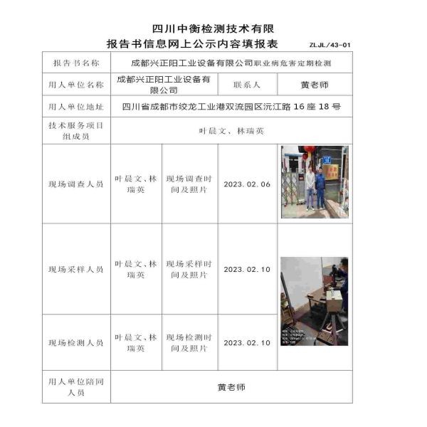 成都興正陽工業(yè)設(shè)備有限公司職業(yè)病危害定期檢測