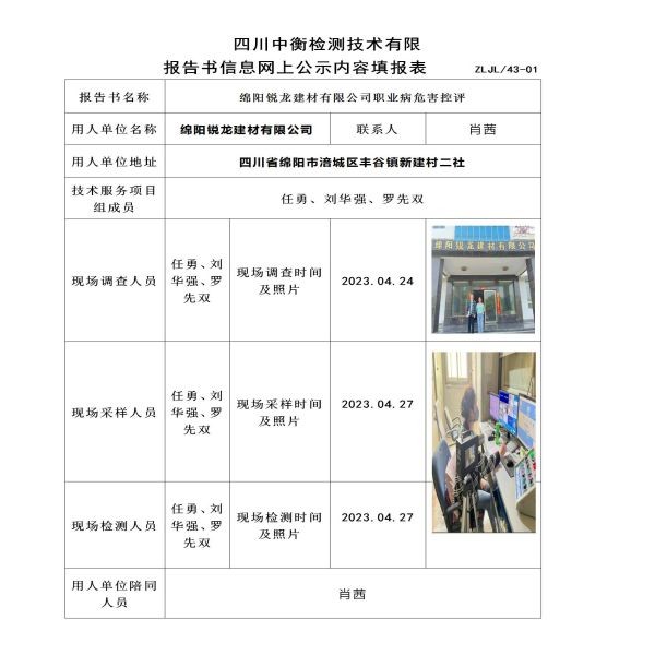 綿陽銳龍建材有限公司職業(yè)病危害定期檢測