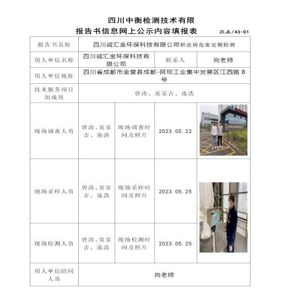四川誠匯金環(huán)保科技有限公司職業(yè)病危害定期檢測