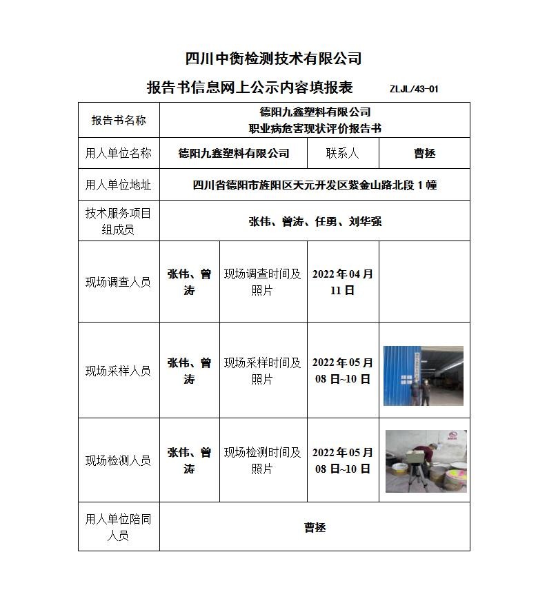 德陽九鑫塑料有限公司職業(yè)病危害現(xiàn)狀評價(jià)