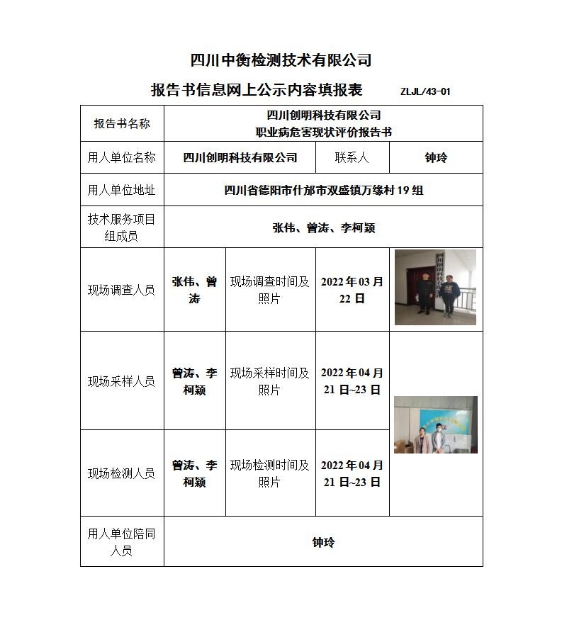 四川創(chuàng)明科技有限公司職業(yè)病危害現(xiàn)狀評價