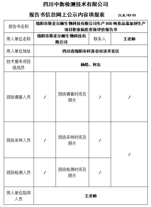 綿陽市斯麥爾顧生物科技有限公司年產(chǎn)800噸食品添加劑生產(chǎn)項目預(yù)評價