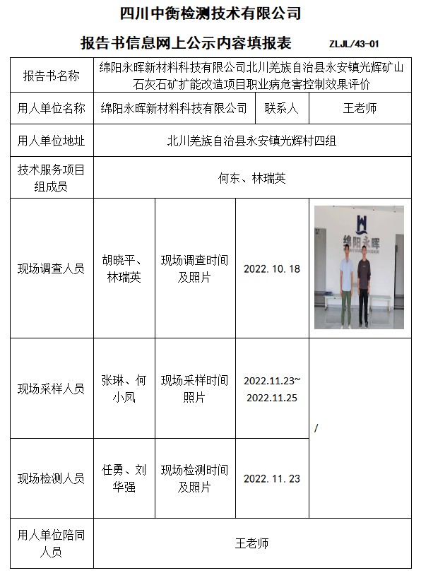綿陽(yáng)永暉新材料科技有限公司北川羌族自治縣永安鎮(zhèn)光輝礦山 石灰石礦擴(kuò)能改造項(xiàng)目控制效果評(píng)價(jià)