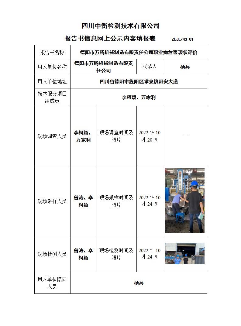 德陽市萬騰機械制造有限責任公司 職業(yè)病危害現(xiàn)狀評價報告書
