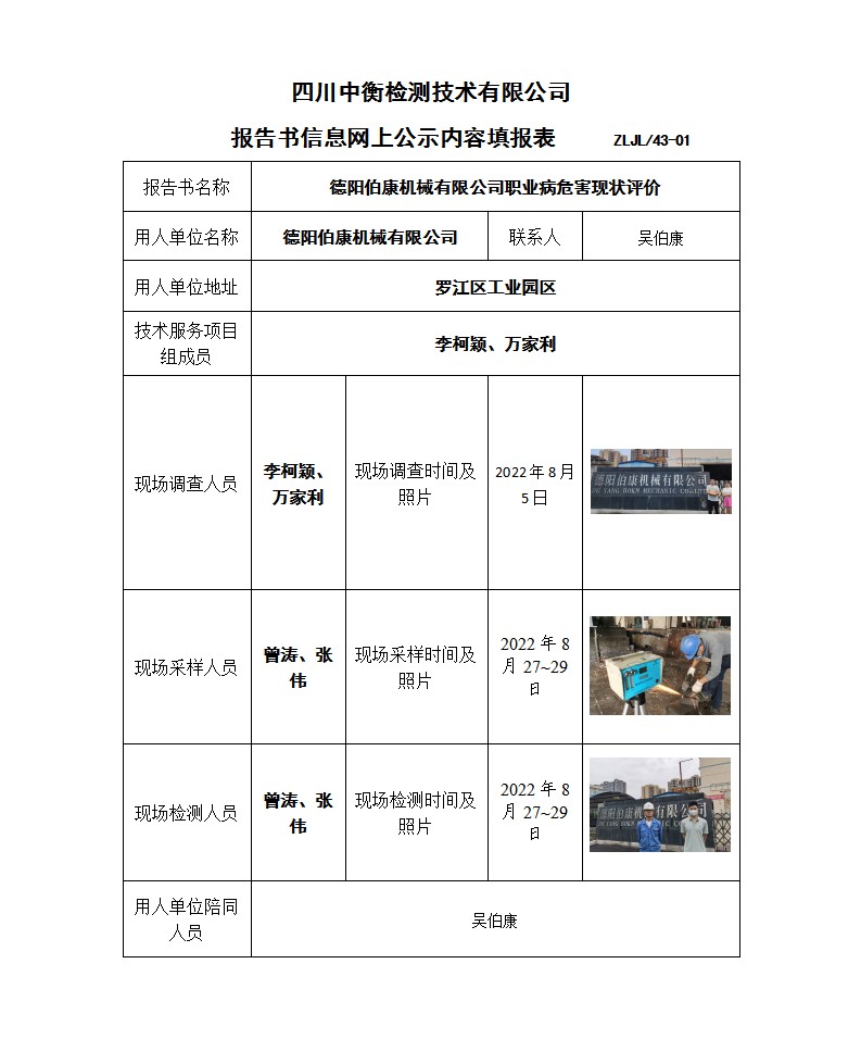 德陽伯康機械有限公司 職業(yè)病危害現(xiàn)狀評價報告書