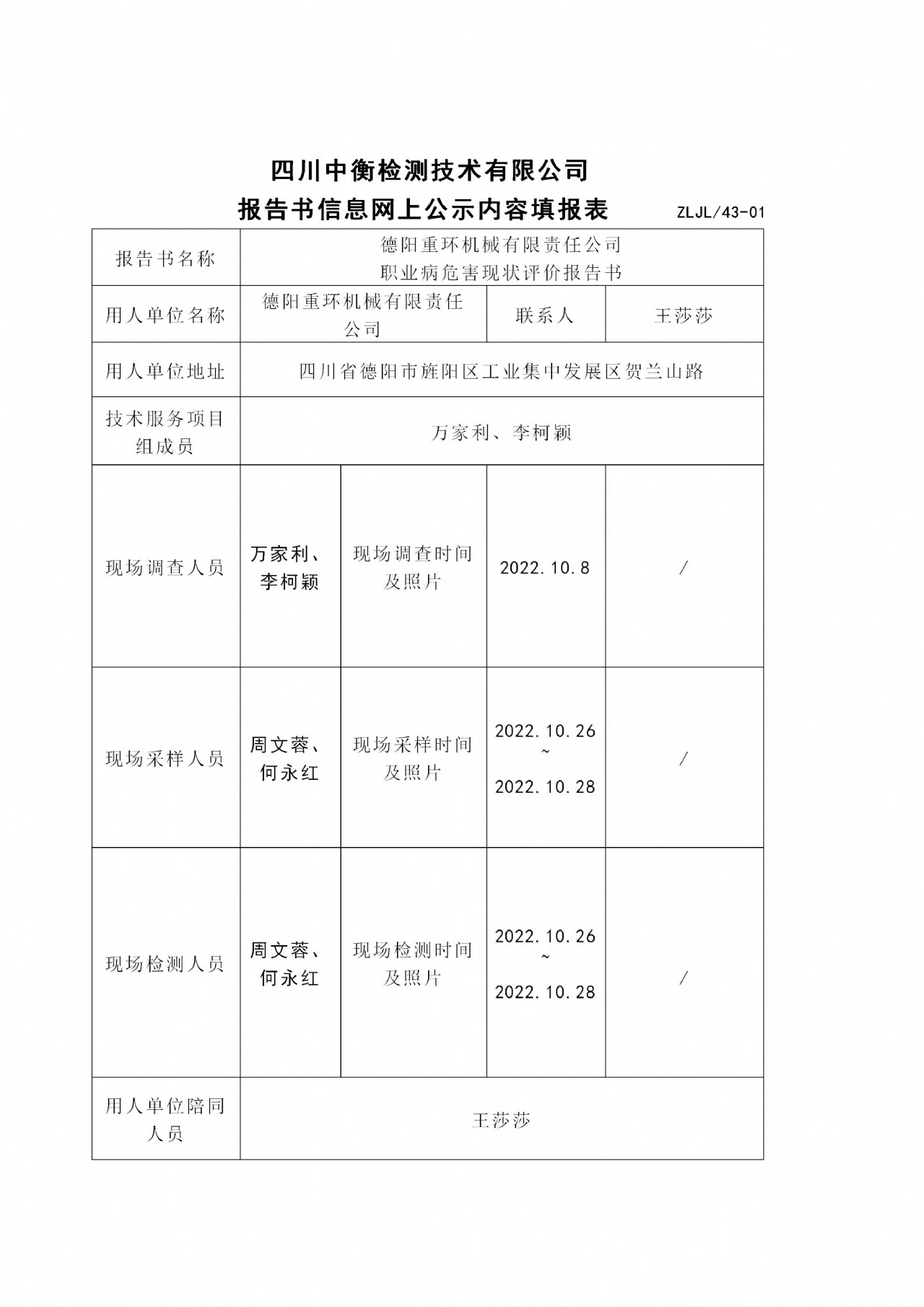 德陽(yáng)重環(huán)機(jī)械有限責(zé)任公司 職業(yè)病危害現(xiàn)狀評(píng)價(jià)